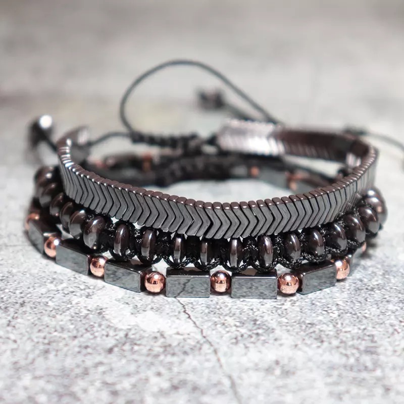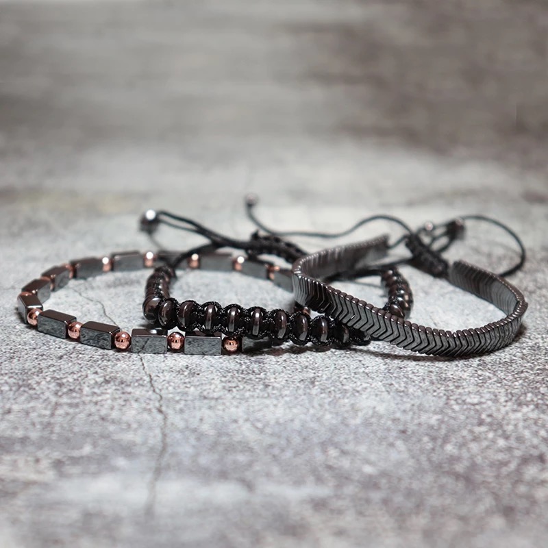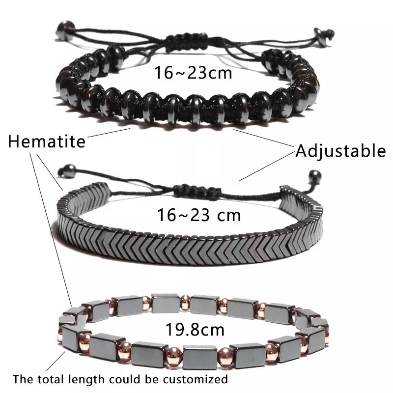 3pc Adjustable Natural Hematite Stone Geometry Bead Bracelets